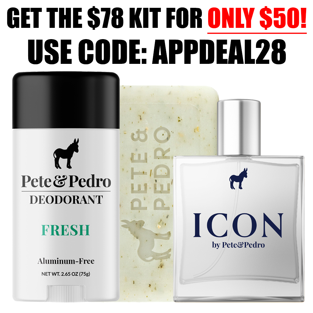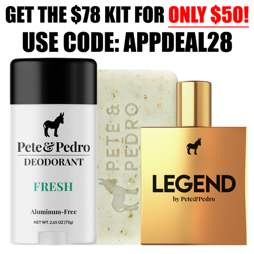 The App Exclusive Kit combines three of our most elite grooming essentials—your choice of Pete & Pedro Eau de Parfum, our best-selling FRESH Natural Deodorant, and our FRESH Hydrating & Exfoliating Body Bar—into one seamless scent experience.